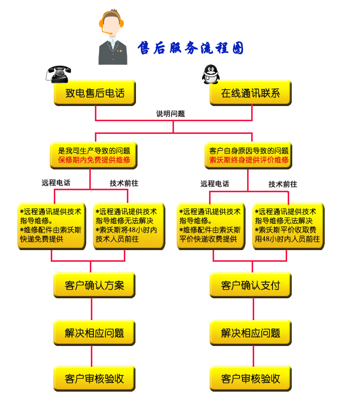 如果需要维修,索沃斯技术人员将通过客户所在地的呼叫中心安排服务。索沃斯不排除上门服务可能由索沃斯服务合作伙伴提供。