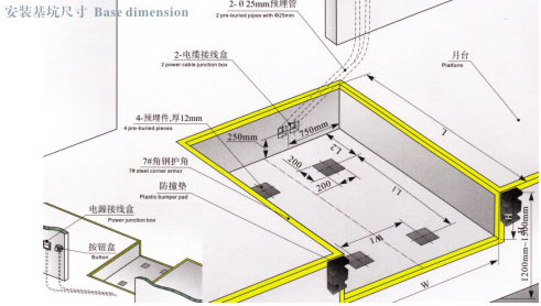●预埋管在地坑外的走向,由客户视按钮安装位置,动力电源接线盒位置决定管路走向。