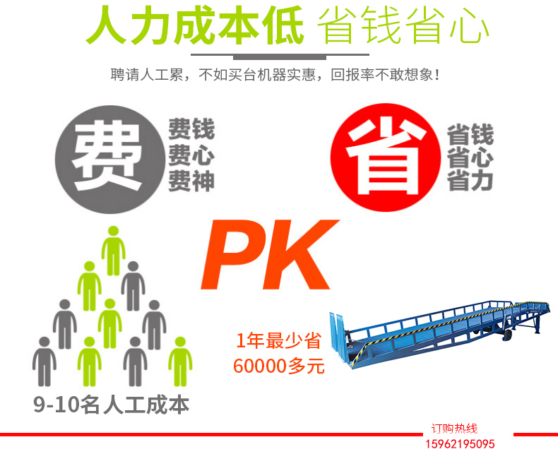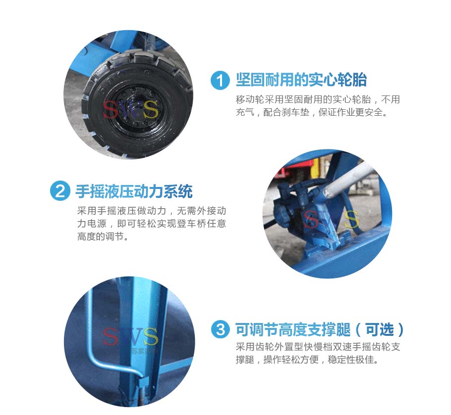 采用人工液压动力,勿须外接动力电源即可轻松实现登车桥的高度调节。