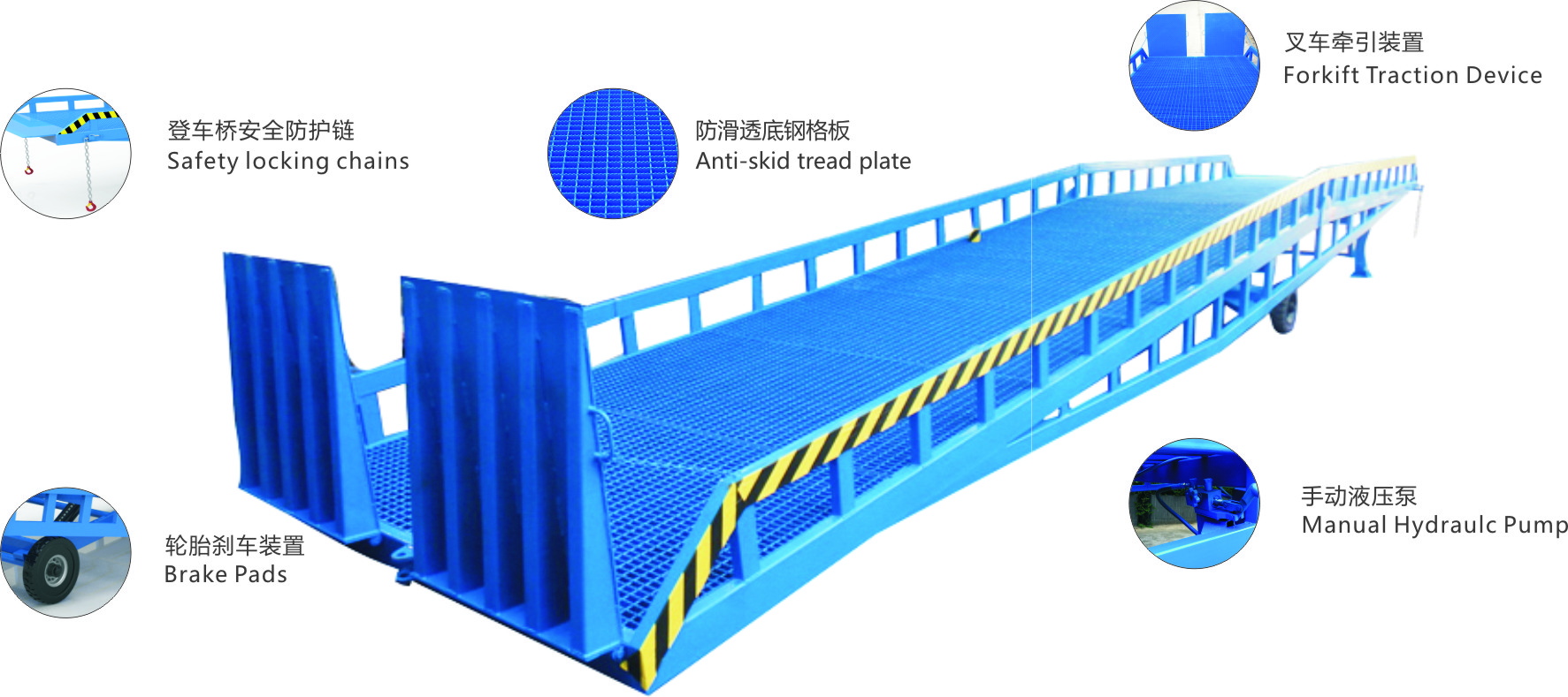 尾部折叠式过渡板和叉车牵引钩可以方便的移动登车桥。