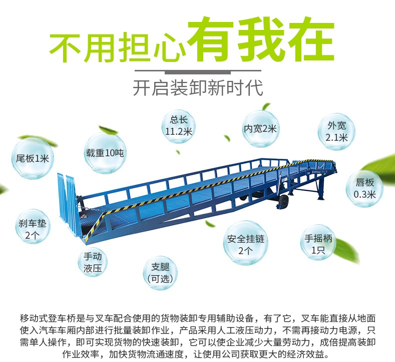 移动液压登车桥是与叉车配合使用的货物装卸专用辅助设备,有了它,叉车能直接从地面进入汽车车厢内进行装卸货物的作业。能够提高货物装卸速度,节省装卸工作的时间以及人力,是您装卸货物的得力助手。只需单人操作,不需动力电源,即可实现货物的安全快速装卸。移动式登车桥用于无装卸设备的货台及流动装卸场所,是与叉车配合使用的货物装卸辅助设备。可根据汽车车厢的高低调节高度,叉车可以直接通过本设备驶入车厢内部进行货物的批量装装卸。